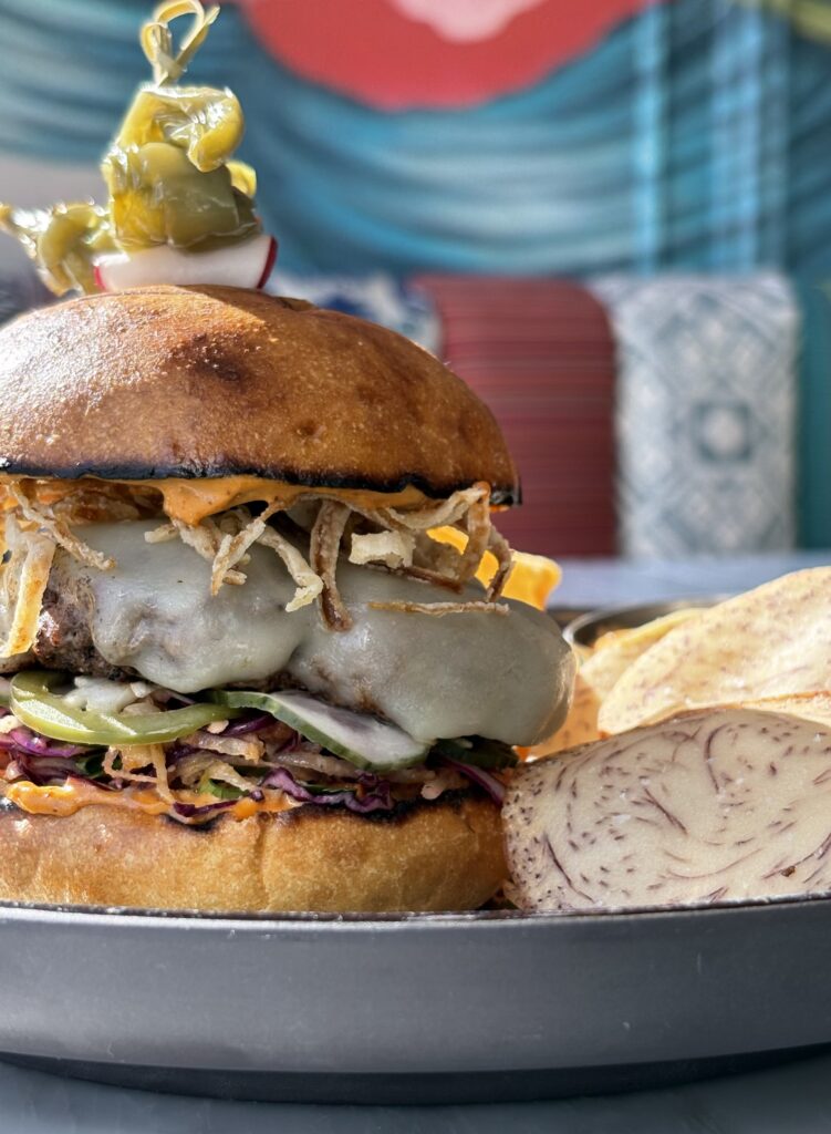 Spiced Halifax beef layered with Chipotle Lime crema, provolone, jalapeño cucumber pickles. crunchy slaw. and crispy onions. Bold vibrant, and built for Burger Week.
